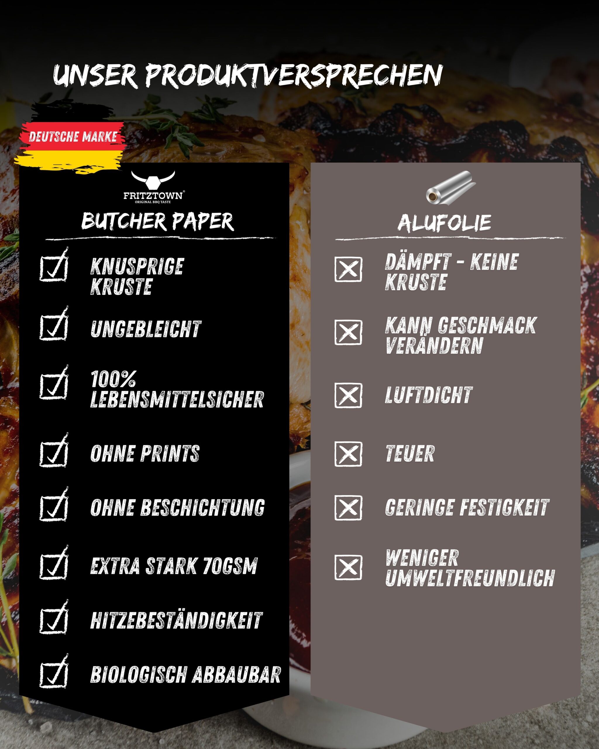 - Hält das Fleisch saftig: Atmungsaktive Barriere, die Fleischsäfte einschließt und Austrocknen verhindert. Für saftiges, zartes Fleisch mit vollem Geschmack.