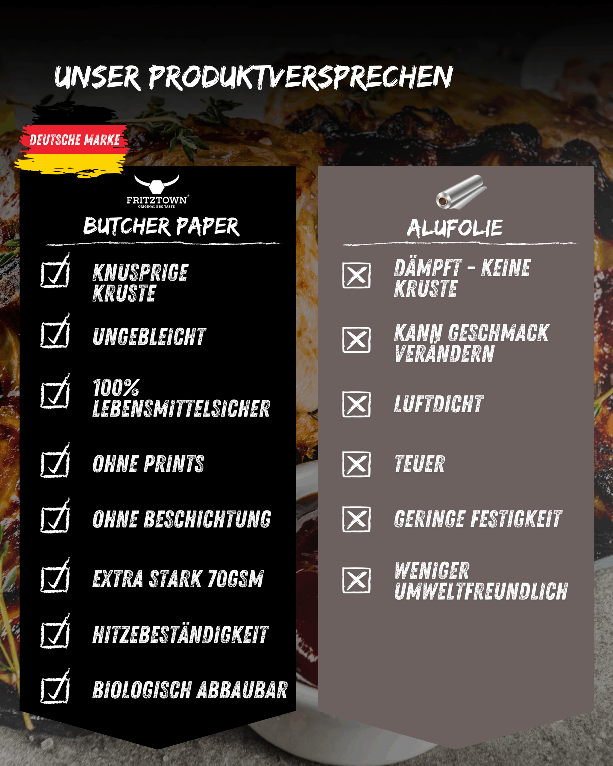 - Hält das Fleisch saftig: Atmungsaktive Barriere, die Fleischsäfte einschließt und Austrocknen verhindert. Für saftiges, zartes Fleisch mit vollem Geschmack.