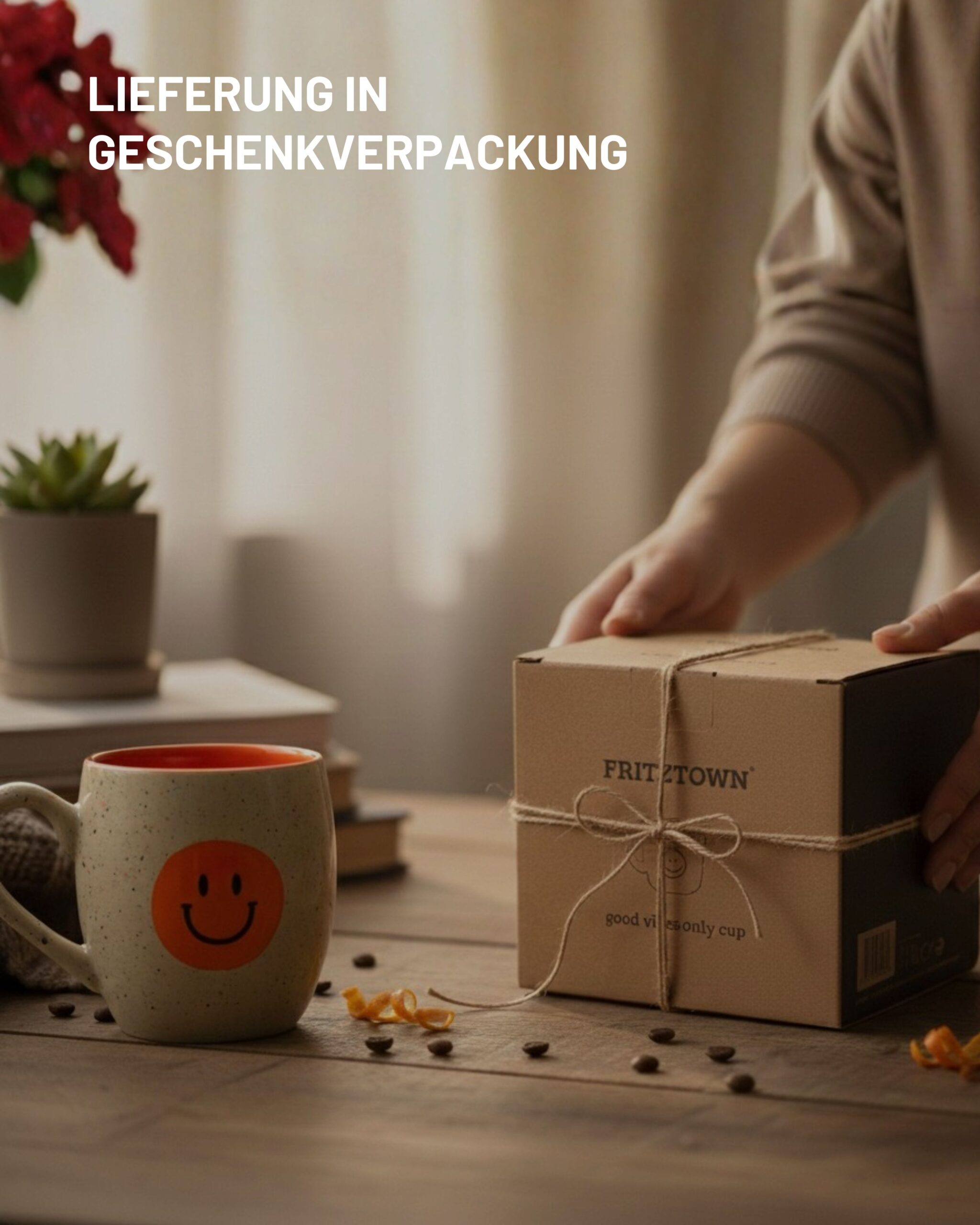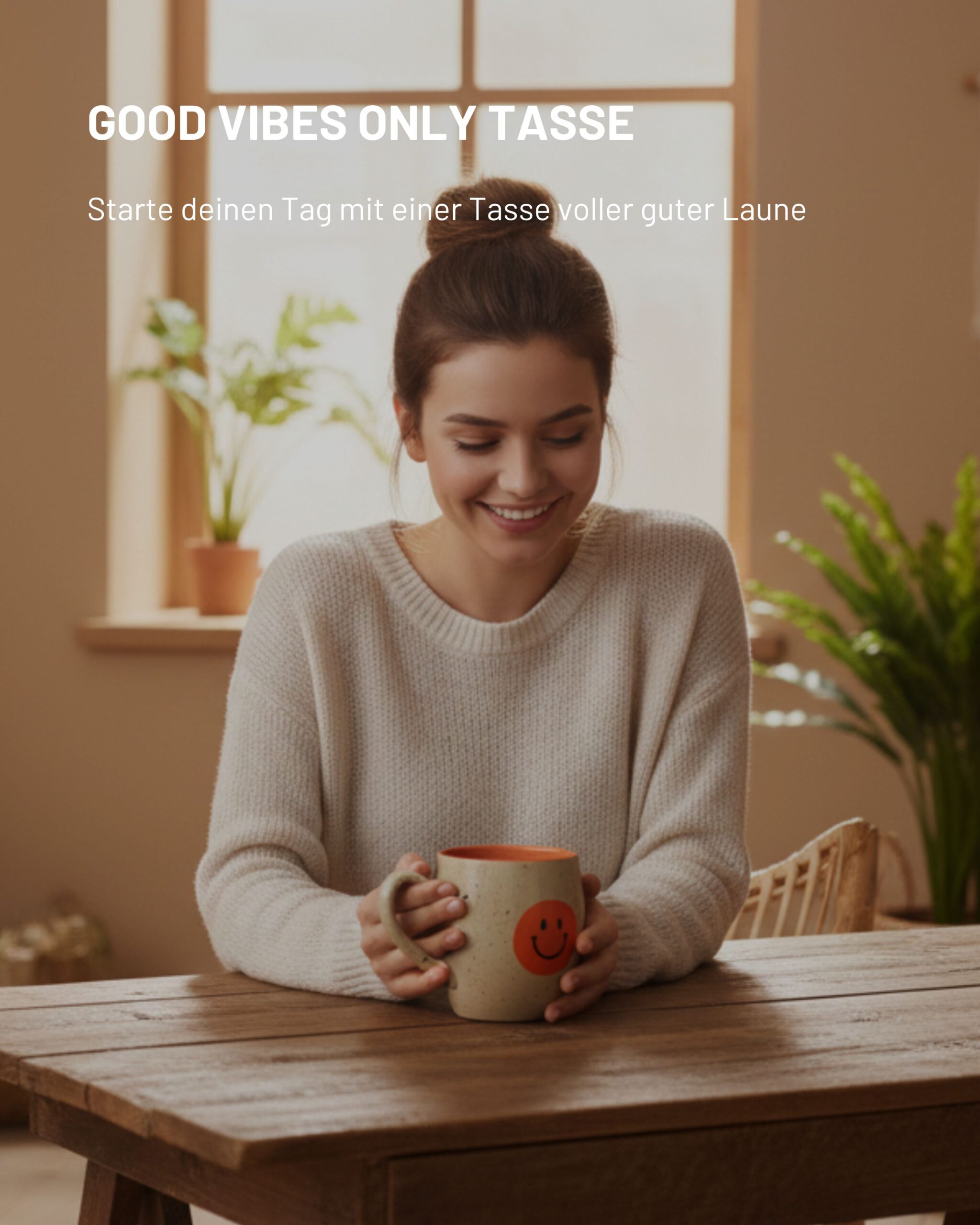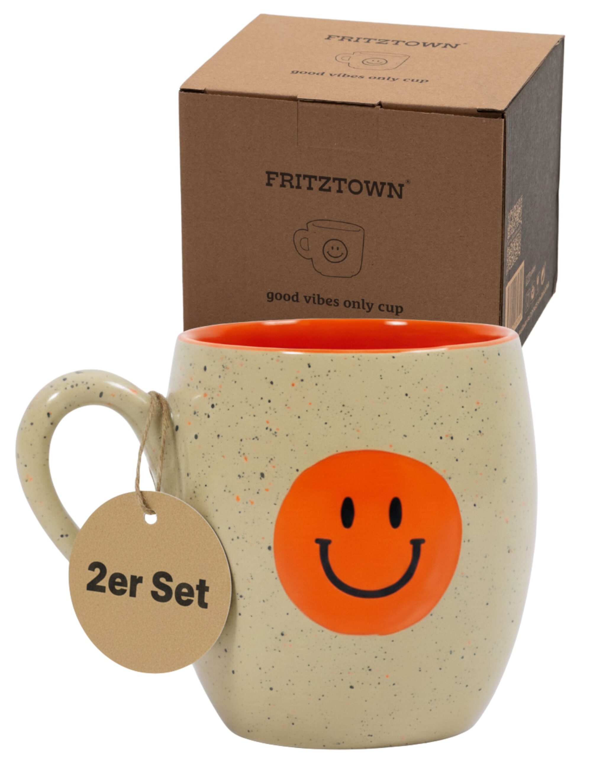 FRITZTOWN® 2er Set Good Vibes Only Tasse 440ml | Große stylische Keramiktasse mit Smiley für Kaffee & Tee in Geschenkverpackung
